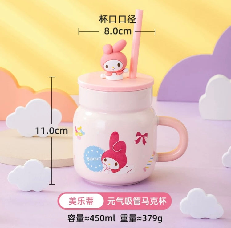 Sanrio Ceramic Mug with Cup Lid & Straw | Hello Kitty My Melody Kuromi Cinnamoroll Pochacco - Cup Drinkware