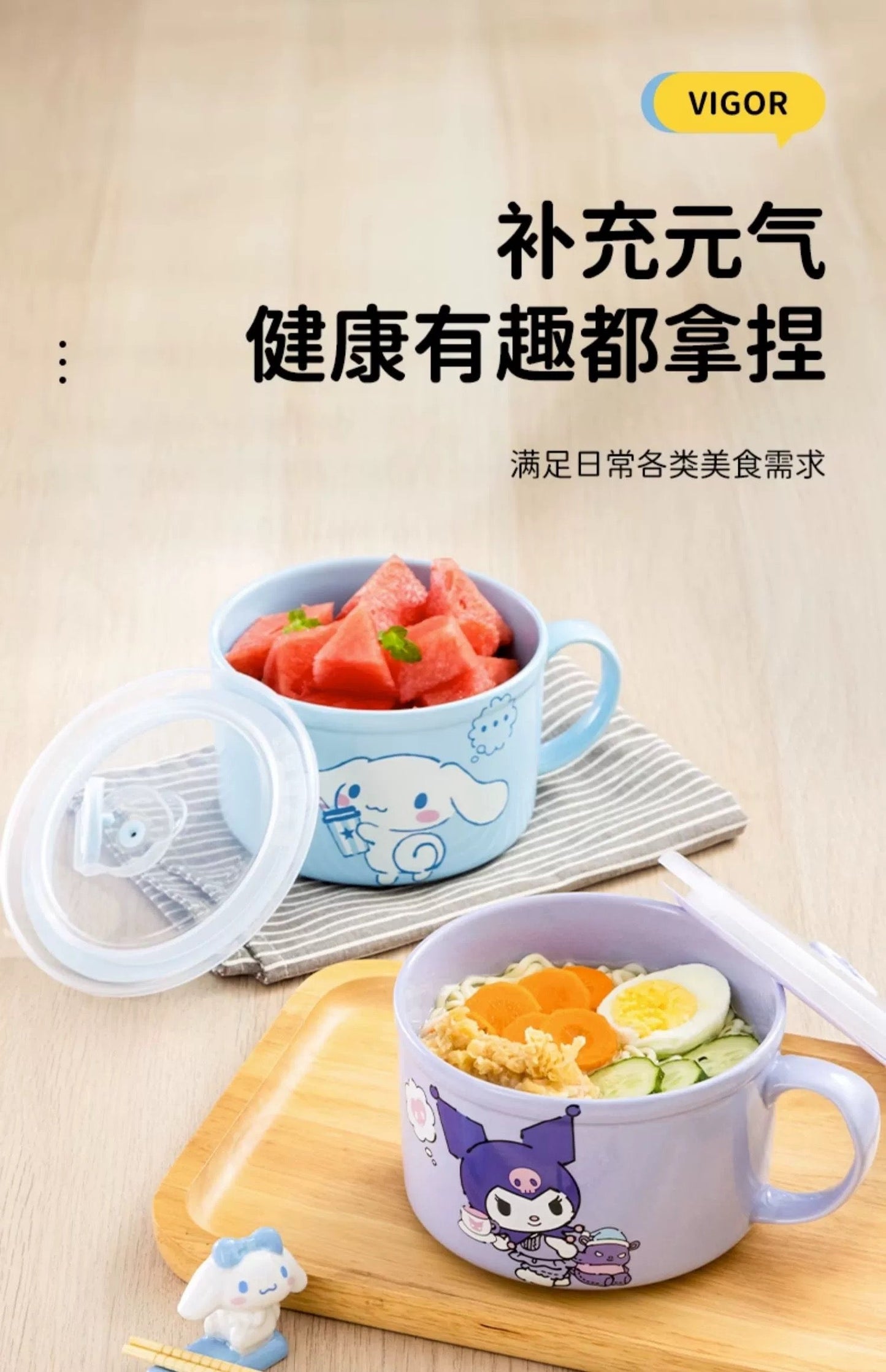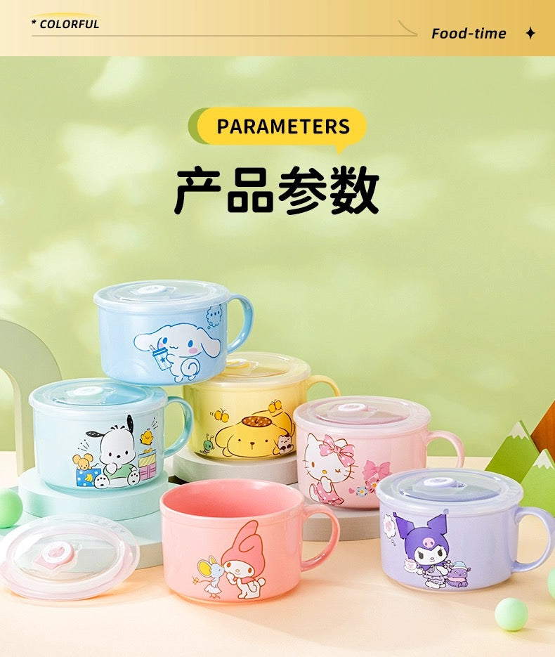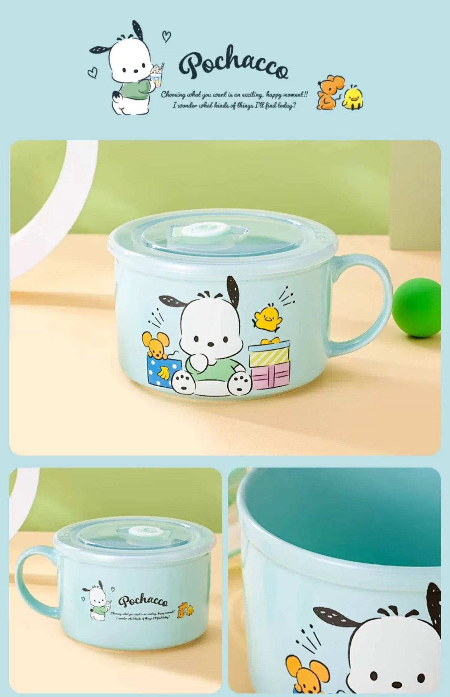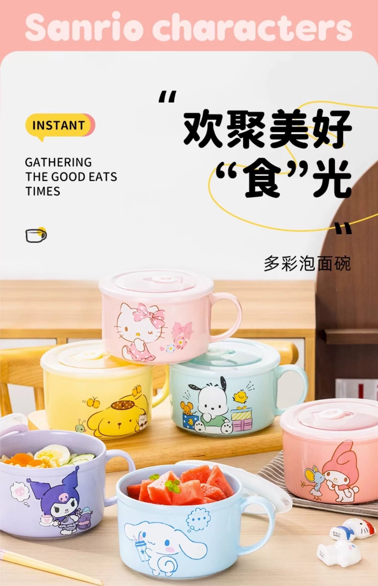 Sanrio Ceramic Bowl with Plastic Cover | Hello Kitty My Melody Kuromi Cinnamoroll Pompompurin Pochacco - Rice Noodles Bowl Food Box