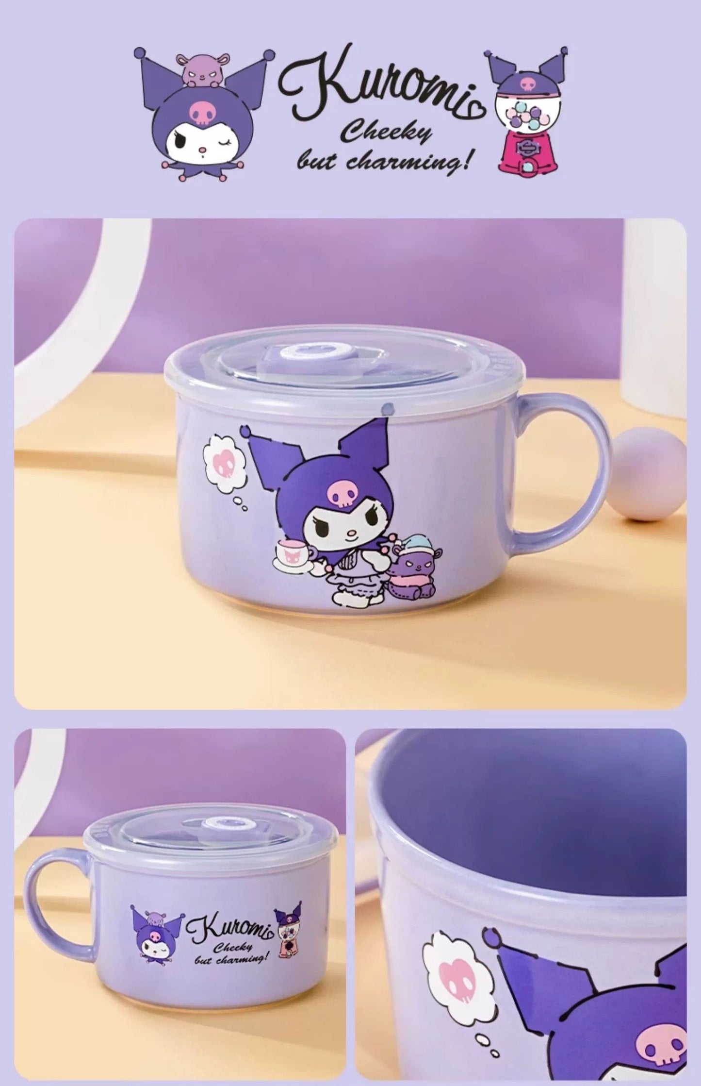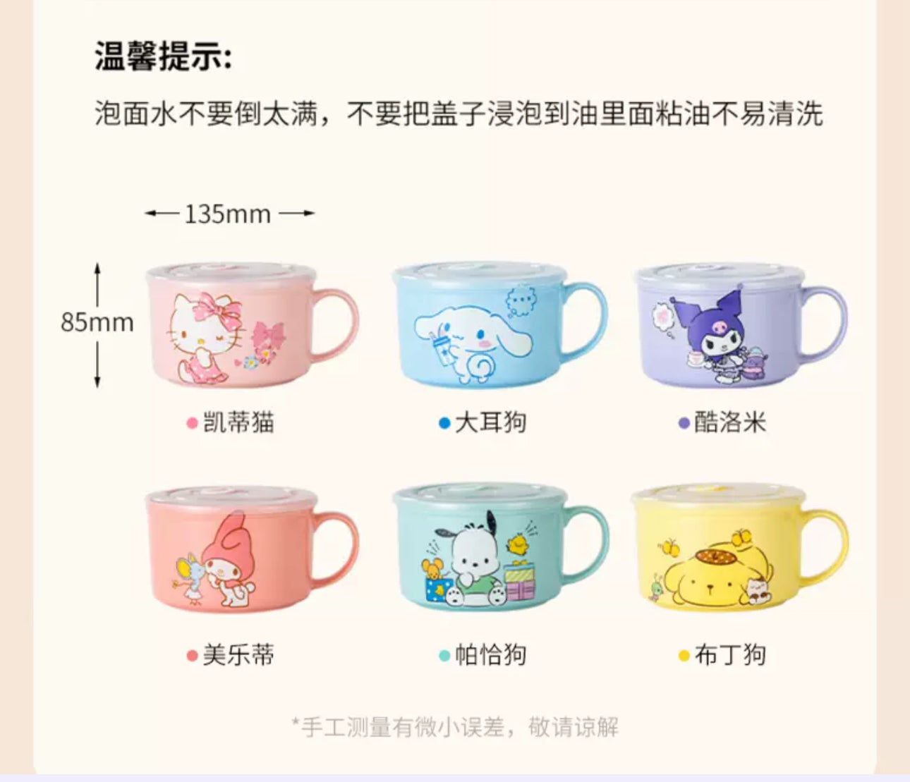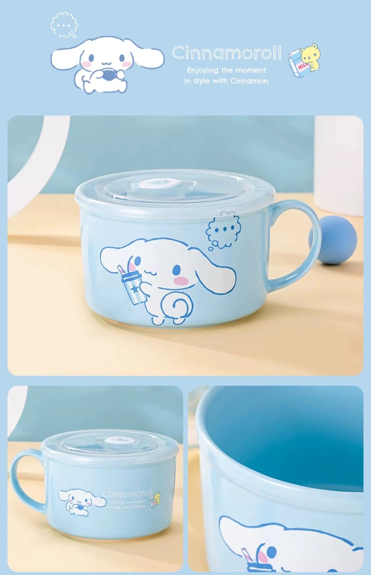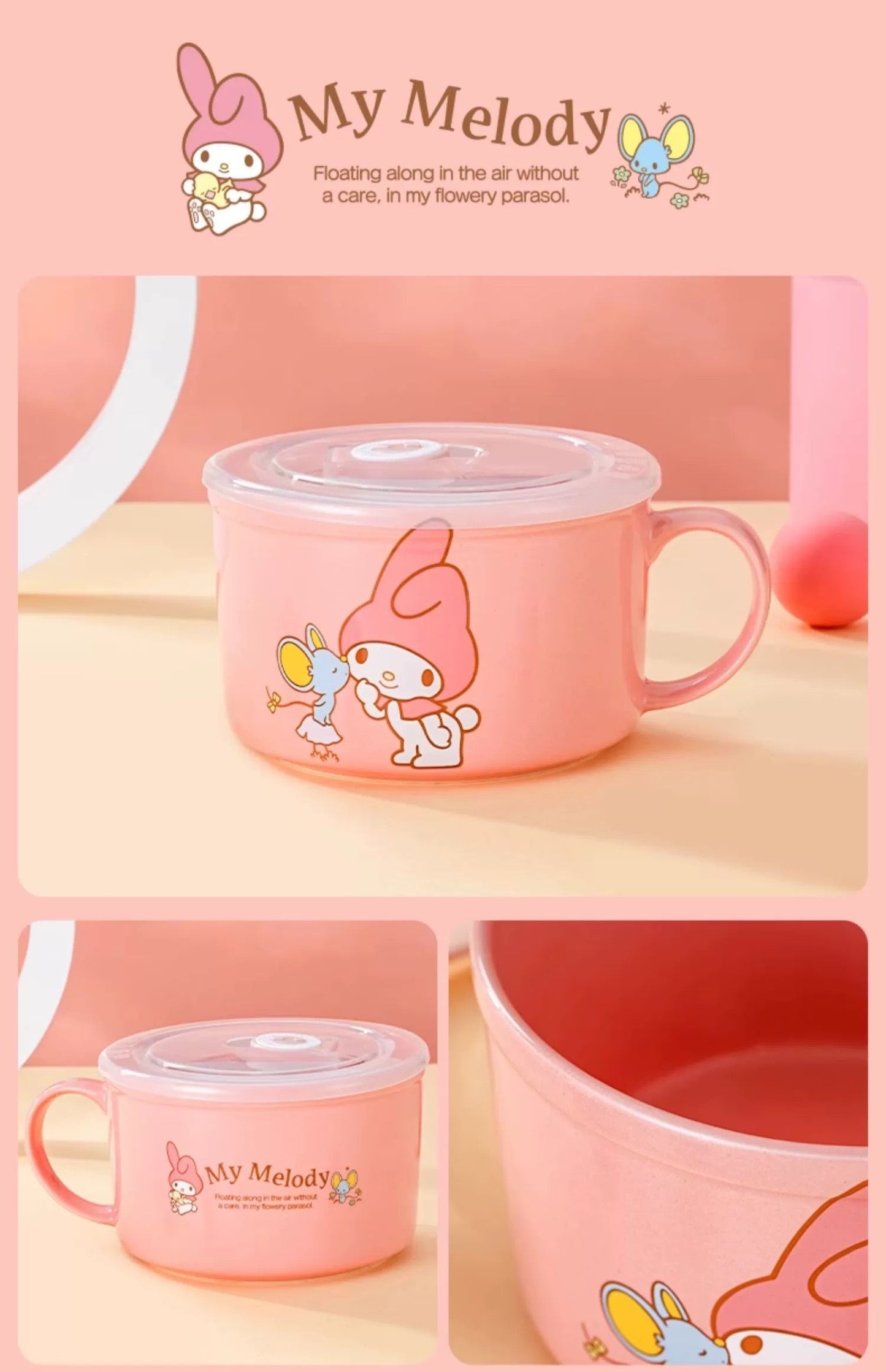 Sanrio Ceramic Bowl with Plastic Cover | Hello Kitty My Melody Kuromi Cinnamoroll Pompompurin Pochacco - Rice Noodles Bowl Food Box