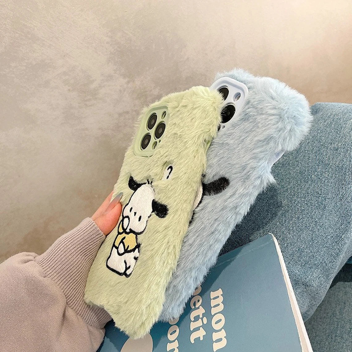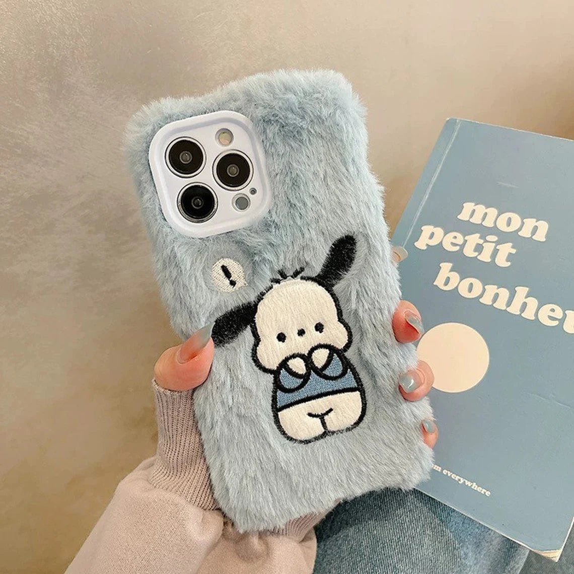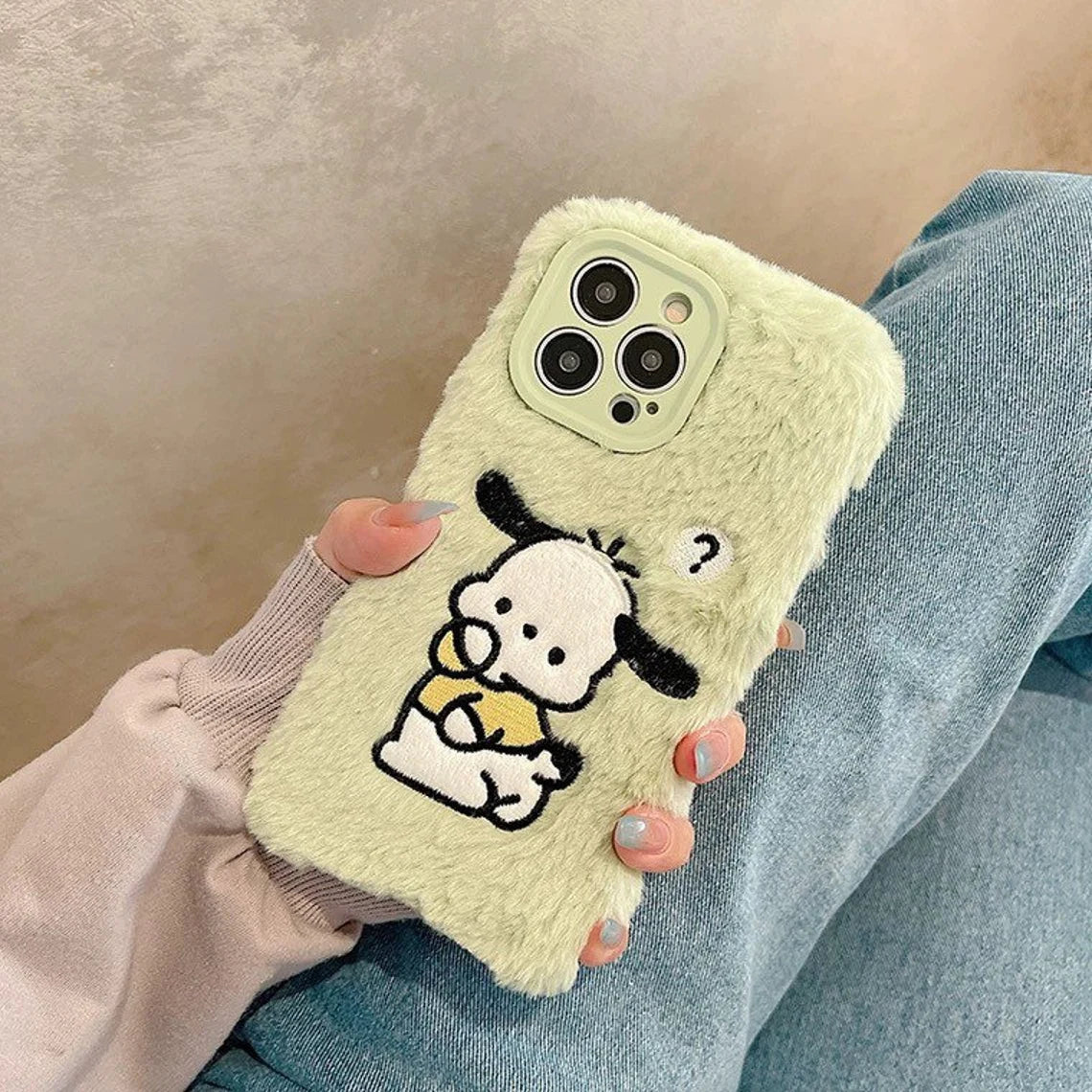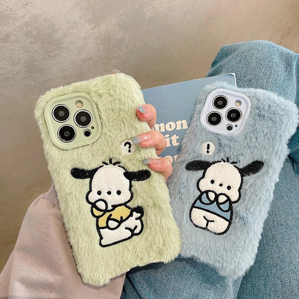 Japanese Cartoon Cute Pochacco Fluffy with Embroidery Blue Green iPhone Case 11 12 13 14 Pro Promax