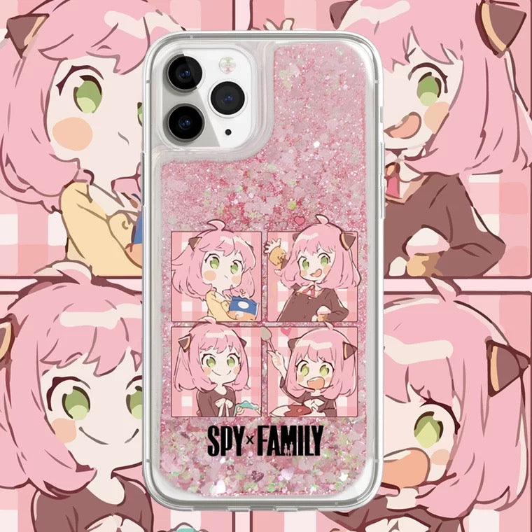 Japanese Cartoon SPY Family Comics Style Anya Forger - Silver Pink Heart Glitter QuickSand iPhone Case 6 7 8 PLUS SE2 XS XR X 11 12 13 14 15 16 Pro Promax 12mini 13mini