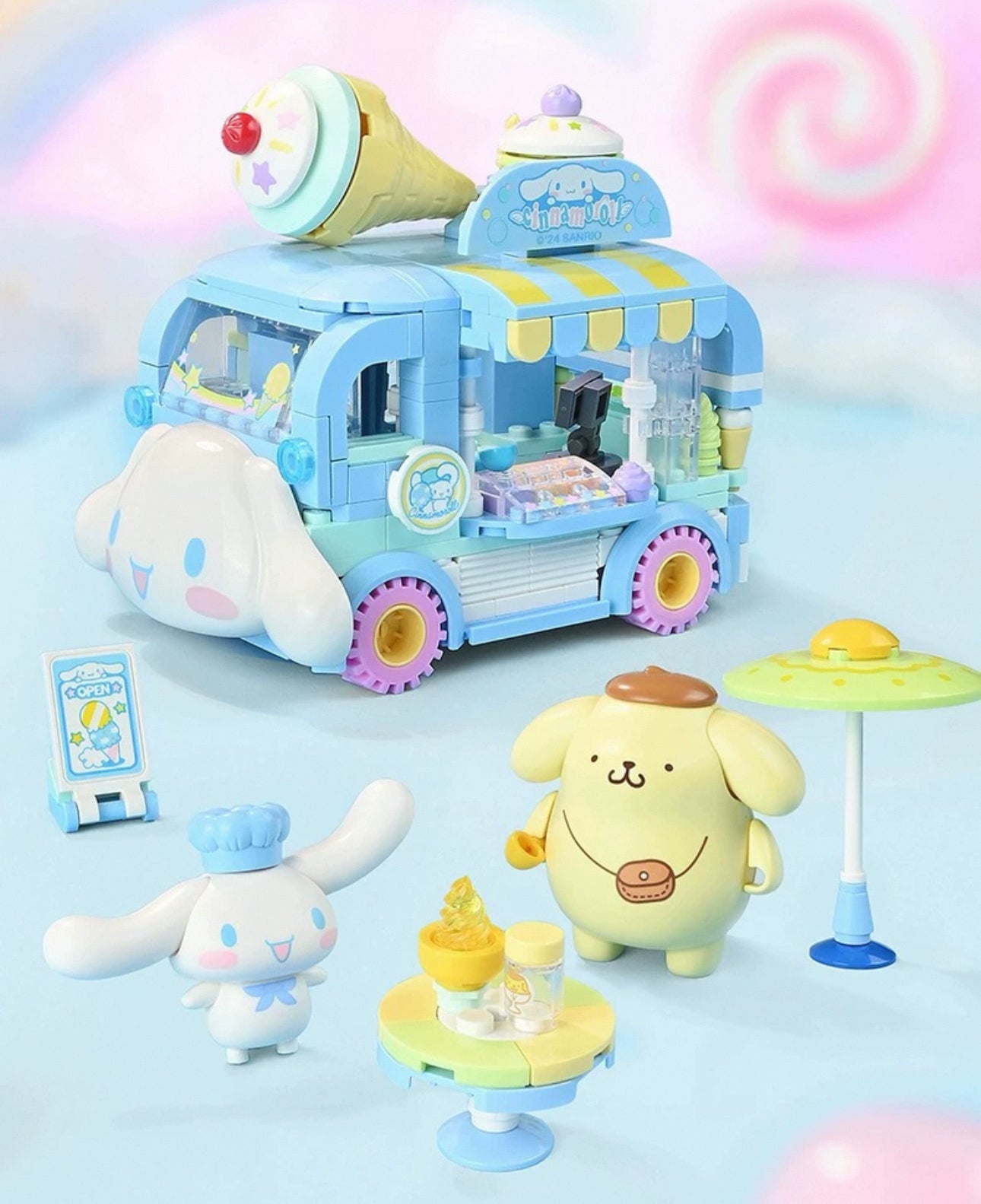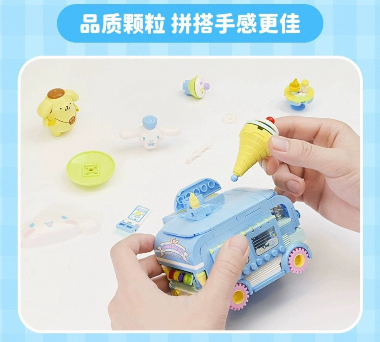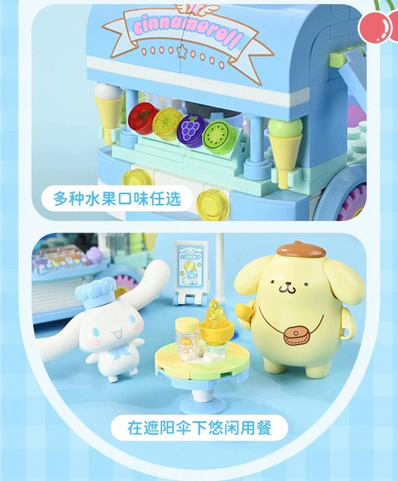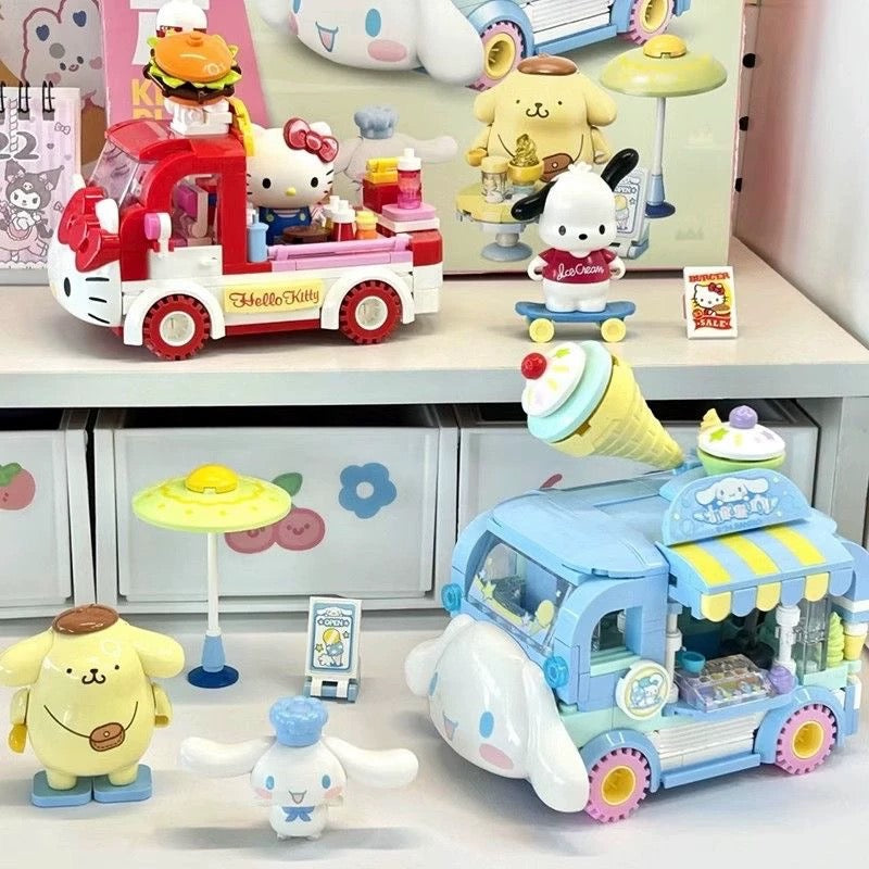 Sanrio Food Truck Series | Cinnamoroll Ice Cream Car with Cinnamoroll Pompompurin - Moveable Car Building Blocks Toy Collections