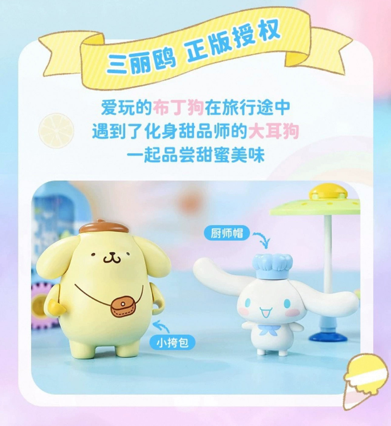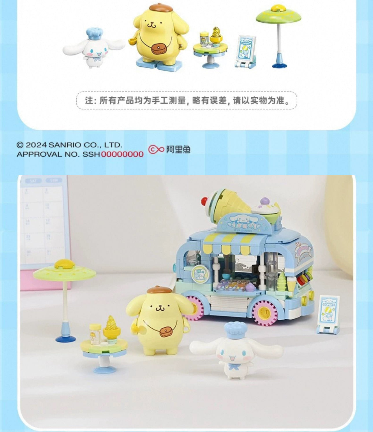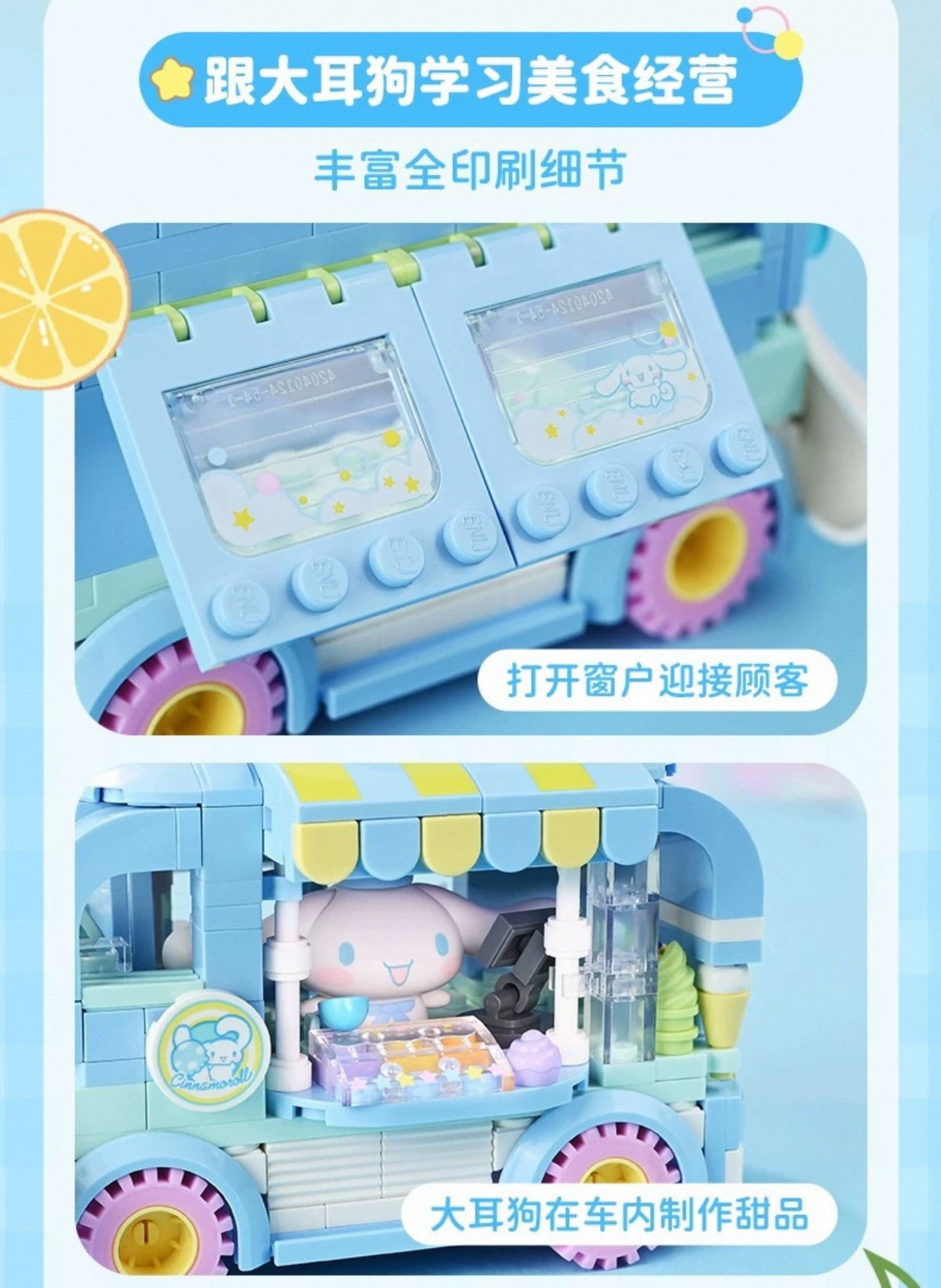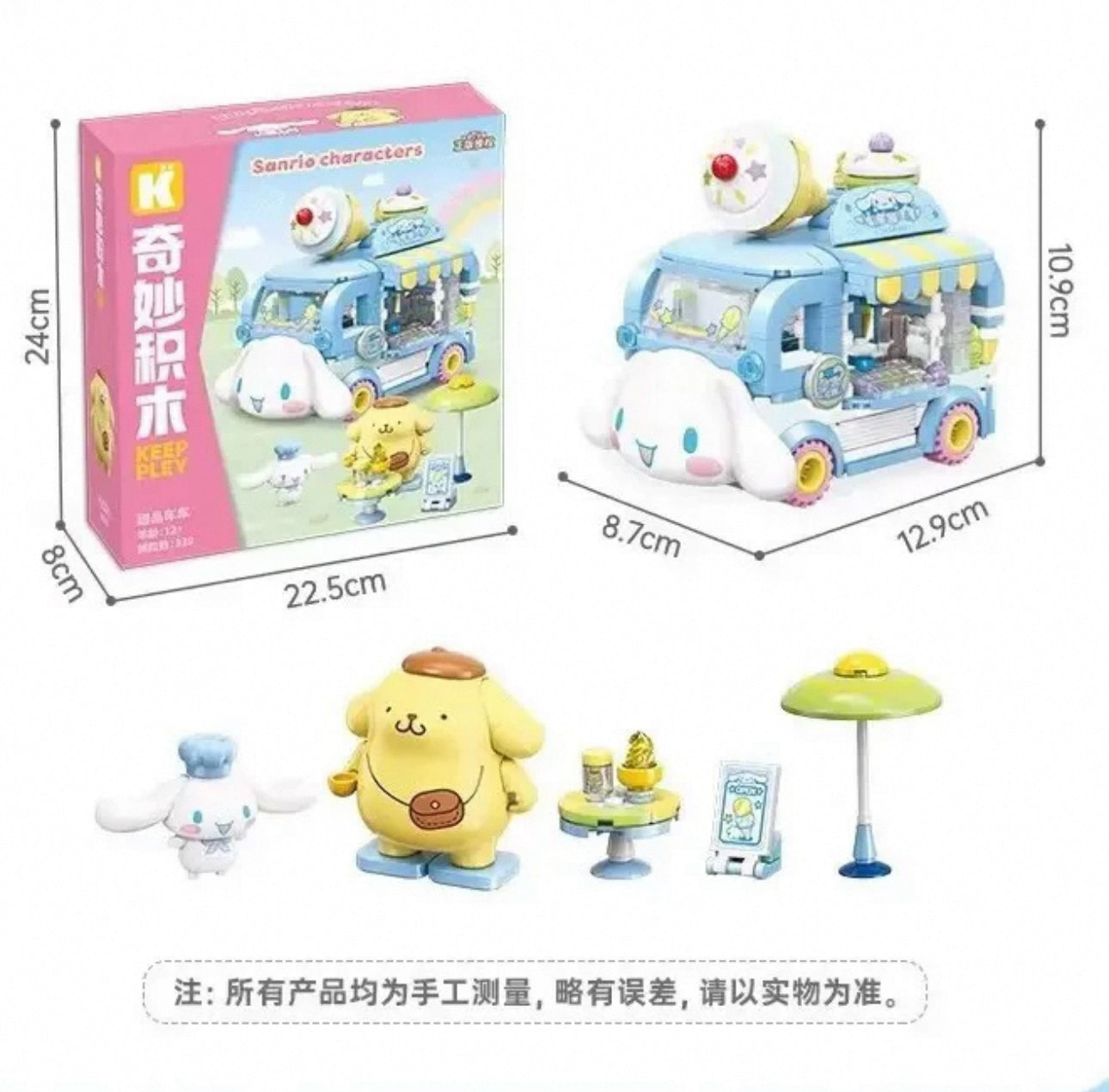Sanrio Food Truck Series | Cinnamoroll Ice Cream Car with Cinnamoroll Pompompurin - Moveable Car Building Blocks Toy Collections